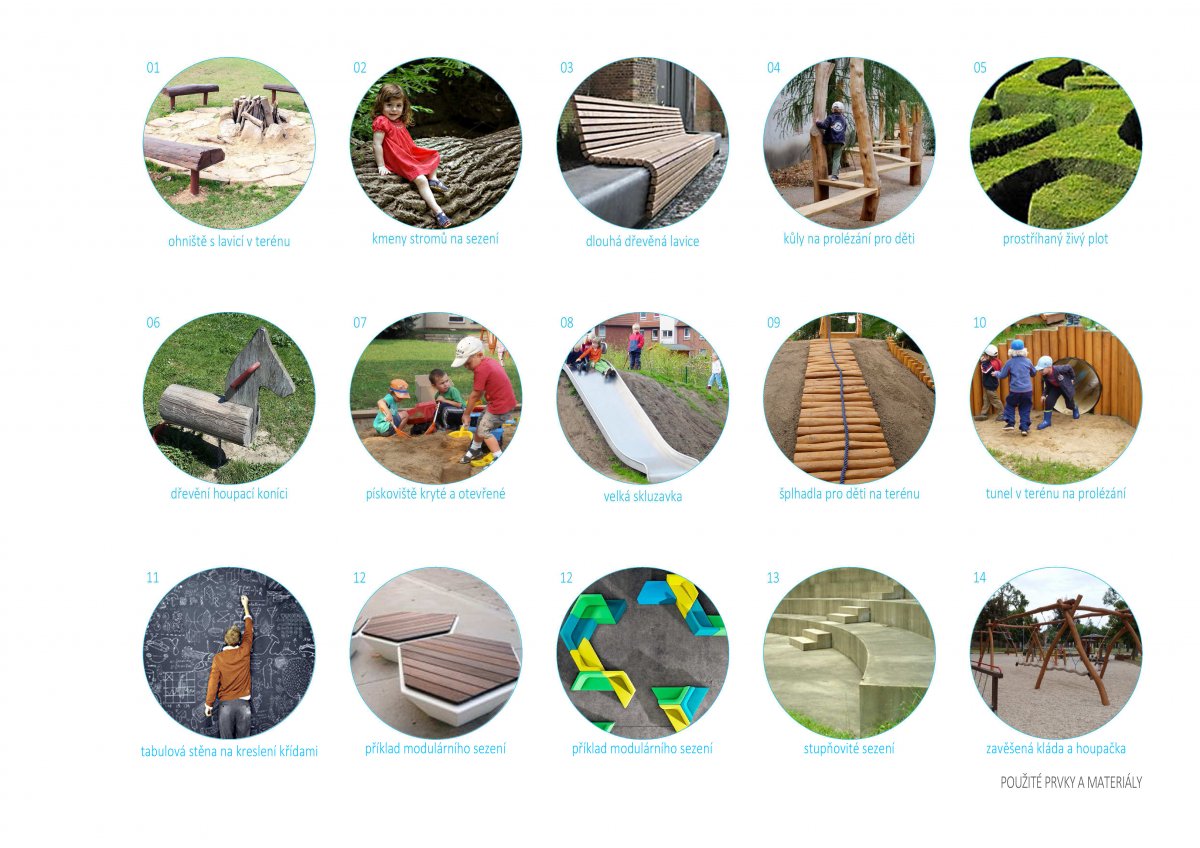 Celé území je materiálově sjednoceno. V mobiliáři převládá klasická nestárnoucí kombinace betonu a dřeva. Nový povrch zadní pěšiny je asfaltový, v průchodech mezi domy je navržena velkoformátová betonová dlažba. Plocha je narušena gumovým dopadovým materiálem, a to u boulderu, posilovacích strojů a v dětském hřišti. Asfalt je zvolen z důvodu jízdy dětí na odrážedlech, kolech, trojkolkách a koloběžkách, kdy na jiných površích jsou kolečka výrazným zdrojem hluku.