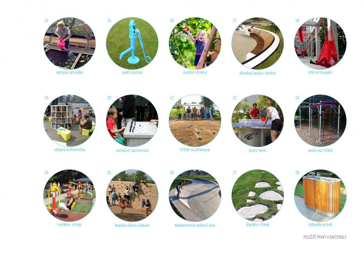 Mimo tato centra je cesta doplněna dalšími novými prvky. Po obou stranách relax zóny jsou navrženy dvě veřejné zahrádky. Při každé je vodní pumpa čerpající dešťovou vodu z nových v zemi zakopaných nádrží (zachytávána je ze střech panelových domů, přebytek je vypouštěn zpět do kanalizace). Dále jsou při okrajích území umístěny nové sušáky na prádlo. V severozápadním cípu řešeného území na vyvýšenině je navrženo klasické, do terénu částečně zapuštěné, ohniště s posezením kolem něj. Přilehlá plocha je srovnána a upravena pro možnost dětských her a sportů (uvažována již spíše pro teenagery – starší děti), prostorově i hlukově náročnějších. Je tu záměrně ponechána volnost a podpoření stávajících aktivit, jako je například zimní bobování, a sáňkování a podobně.