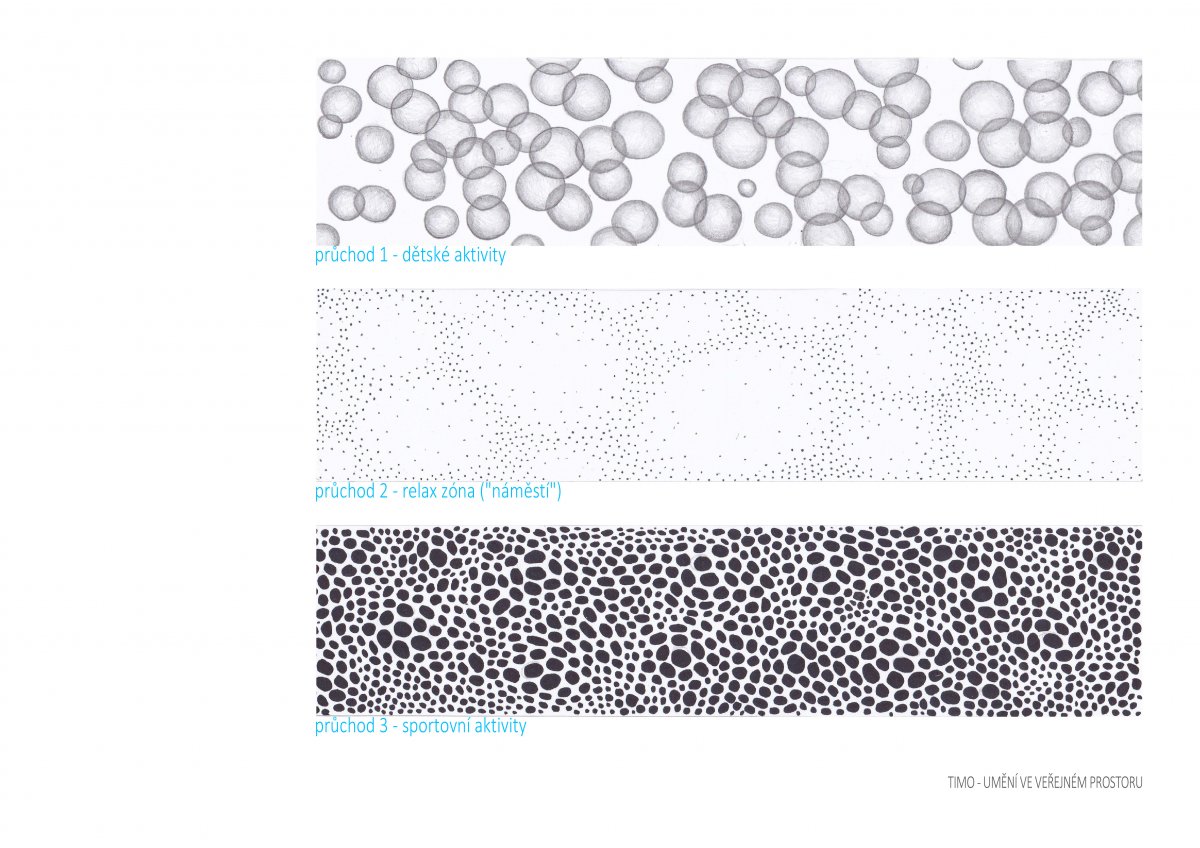 Návrh vychází ze stávající situace liniového uspořádání domů a okolních ploch, která má za následek rozdělení prostoru na dva pásy s domy jako bariérou uprostřed. Tohoto na první pohled nevýhodného schématu však využíváme ve prospěch diferenciace prostoru a jeho konkrétnější specifikace.