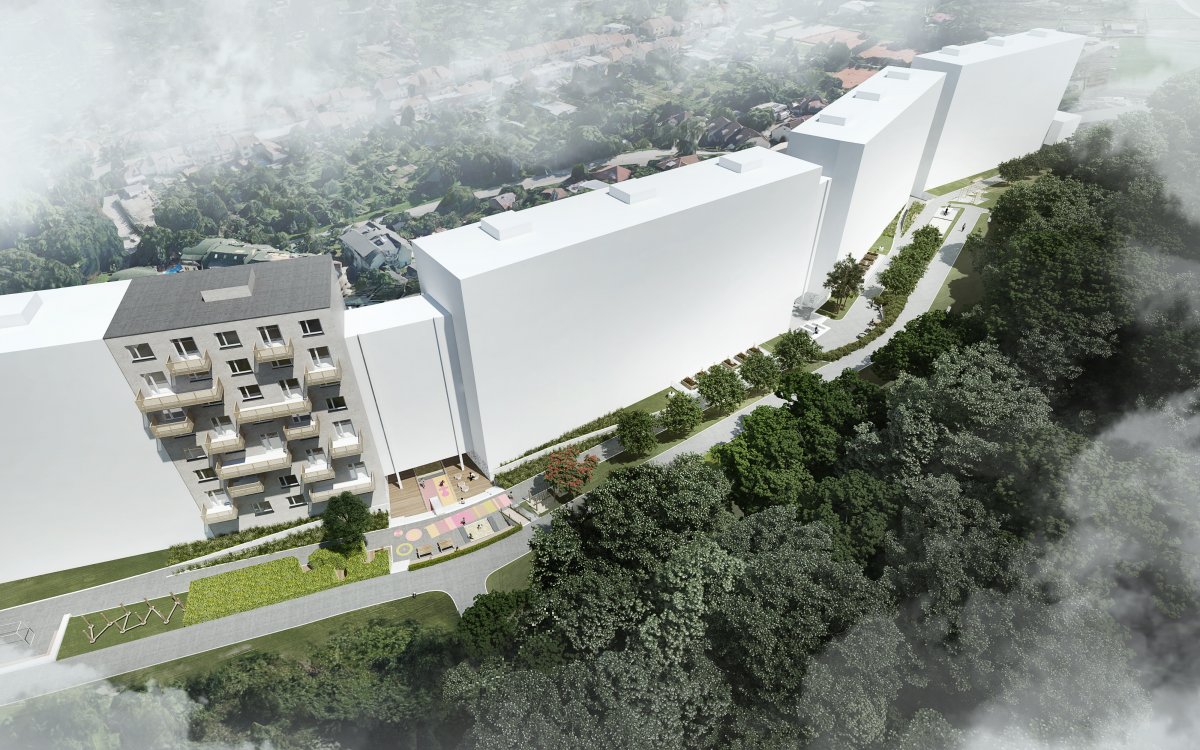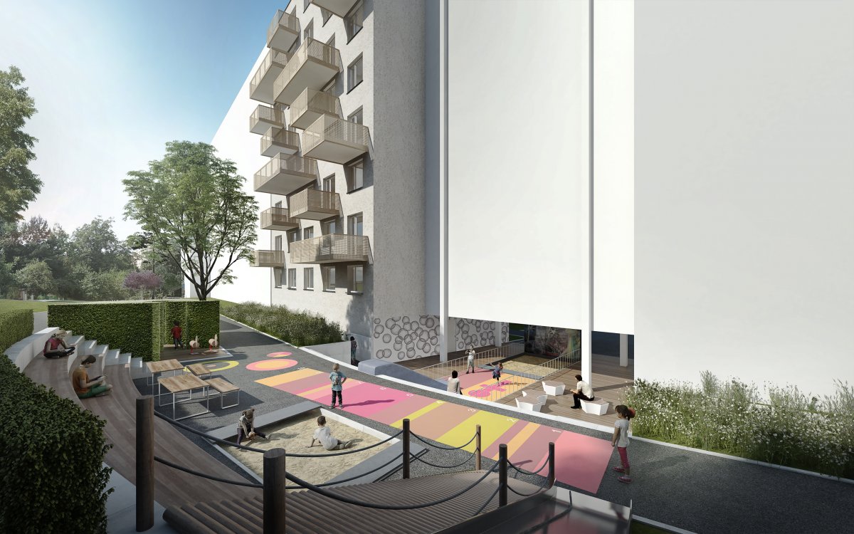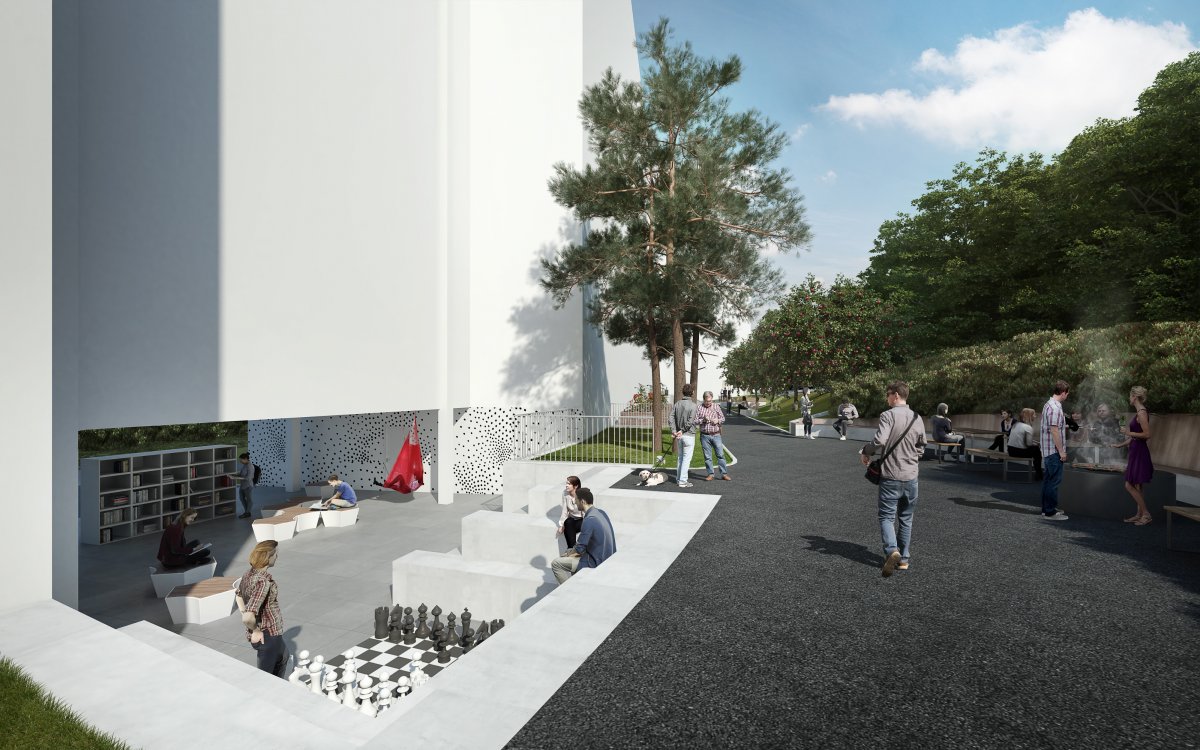 V návrhu je zahrnuta i rekultivace panelového domu ve vlastnictví obce. Je přebarven do jedné zemité barvy a doplněn vyvěšenými balkony různých velikostí. Prostor by se tak mohl oživit nejen přímo na terénu, ale i nad ním. Zároveň by se elegantně narušil stávající stereotyp fasád panelových domů. Tento zásah by se mohl stát inspirací i pro okolní domy.