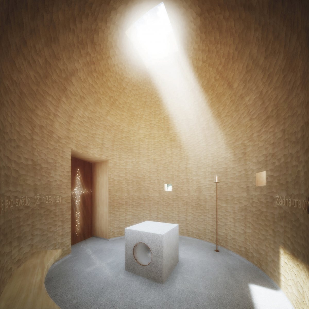 Ze zmaru a zániku vyjádřeného ohořelým pláštěm kaple vstupujeme prostřílenými dveřmi se znamením kříže do světla a života.