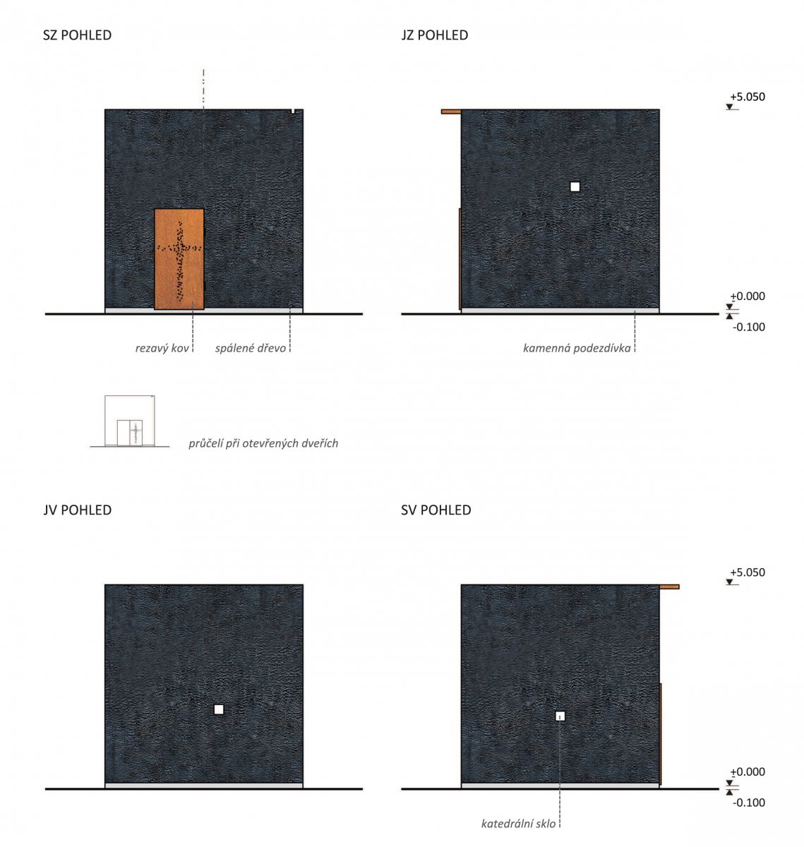 Dveře jsou svařeny z plátů předzrezivělé oceli, perforované do tvaru kříže.