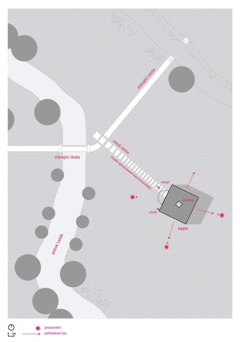 Objekt kaple umisťujeme do volného prostoru mezi silnicí, potokem a svahem s pomníky nad zničenými domy. Vchod je obrácen k hlavní pěší cestě vedoucí od mohyly přes potok Ležák k pomníkům. Od stávající cesty je kaple odsazena a zpřístupněna chodníkem z kamenných kvádrů. Ocelové dveře se znamením kříže jsou zvnějšku jediným viditelným označením kaple.