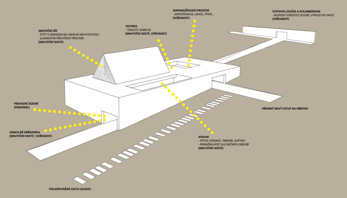 Budova nové smuteční síně je umístěna ve spodní polovině řešeného území. Cílem a záměrem bylo vytvořit clonu vůči vnějšímu okolí, které rozjímání příliš nepřeje. Zdání úmyslně velkého objemu stavby je dosaženo pomocí vložených volných ploch. Hierarchizovaných – veřejných (předprostor kanceláře obřadníka), poloveřejných (prostor vstupu na hřbitov, zároveň prostor pro setkání pozůstalých a shromáždění průvodu) i uzavřených (zelené atrium navazující na smuteční síň).