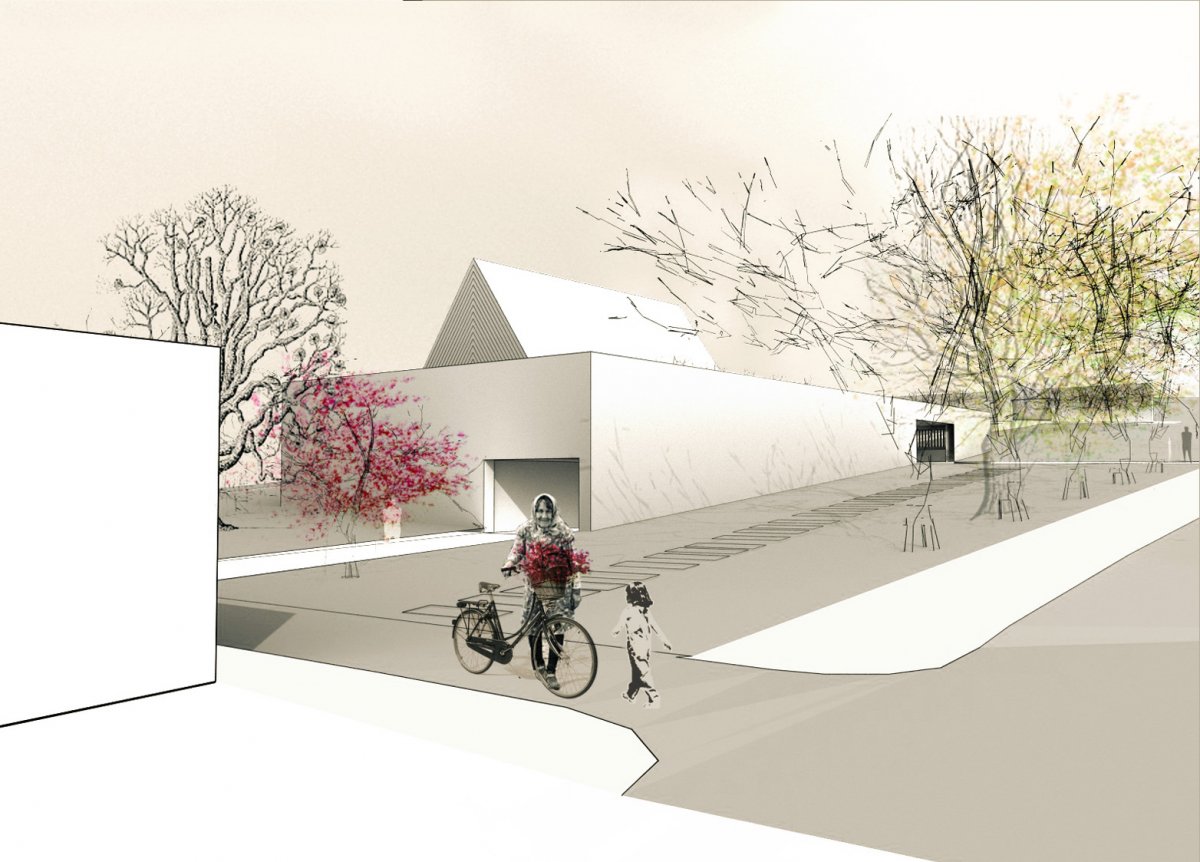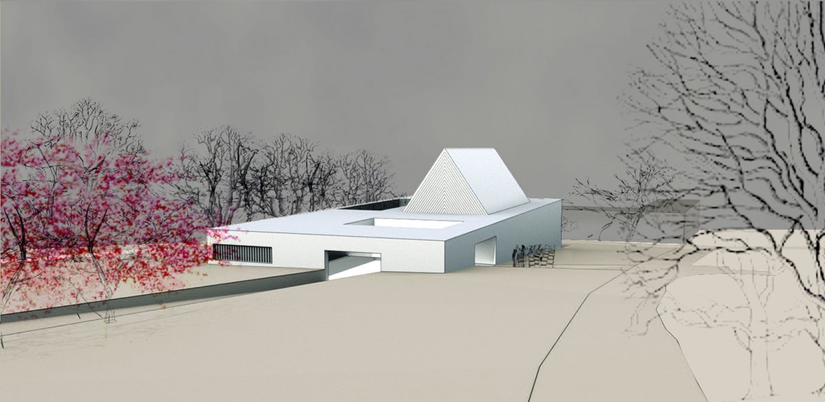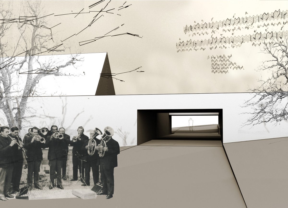 Ostrá střecha smuteční síně vyrůstá z podnože. Podnože měkce vložené do terénu, se dvěma nástupy oddělujícími slavnostní, obřadní patro od provozních všedností. Štít přepisuje valašskou chalupu, dřevěné bednění je trvale obtisknuto do betonu. Pomíjivé, každodenní do přetrvávajícího. Janíkova stodola svojí samozřejmou, jednoduchou krásou je nenápadně přítomna. Tradiční archetyp bude oporou ve chvíli, kdy je třeba bezprostředně čelit křehkosti lidského života.