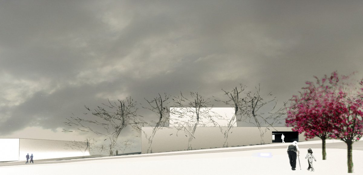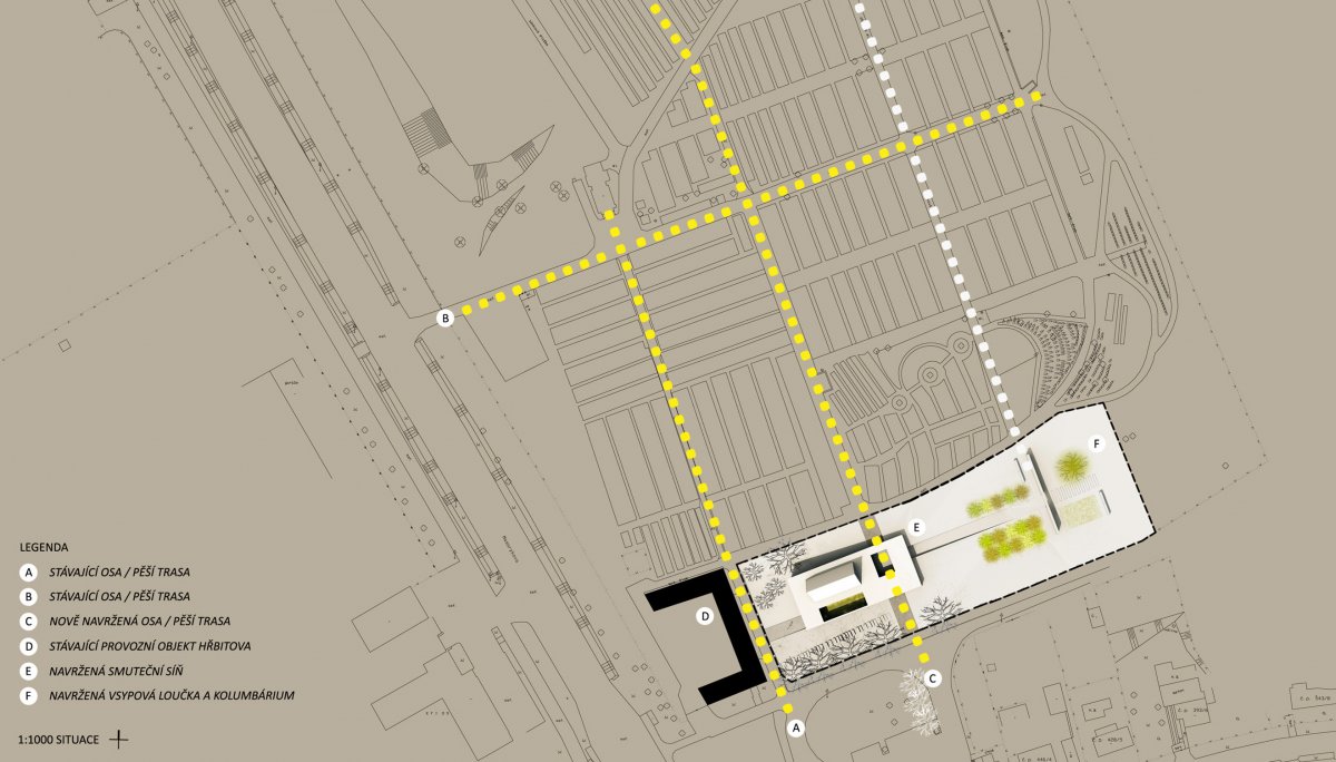 Původní hlavní vstup na hřbitov zůstává, ale je doplněn novou plnohodnotnou osou. Na obřad, ani za návštěvou zesnulých není třeba jít kolem trafostanice, lze projít novou bránou ve střední části pozemku. Venkovní částečně krytý prostor s lavicemi po obvodu poskytuje možnost shromáždění smutečních hostů či odpočinek běžným návštěvníkům.