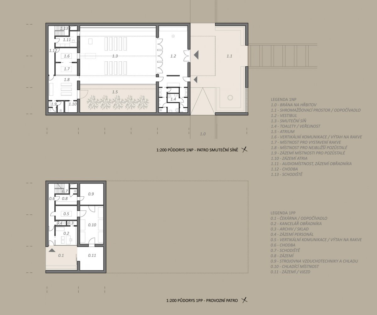 Umístění provozního zázemí ovlivnilo jednak osazení budovy na terén, jednak návaznost na stávající služby hřbitova (pohřební, prodej květin atd.). Vzhledem k četnosti 1-2 pohřbů denně a snaze o provozně úsporné řešení bylo rozhodnuto o sdružení vstupu pro zaměstnance a místa, kudy budou naváženy rakve do objektu. Před místností chladírny je krytý nevytápěný prostor, kde lze auto po vykládce zaparkovat, aby nebránilo provozu a přístupu veřejnosti do kanceláře obřadníka. Tento vstup / vjezd je umístěn naproti stávajícímu vstupu pro veřejnost do budovy pohřební služby. V zázemí na této úrovni podlahy se dále nachází zázemí personálu, strojovna vzduchotechniky a chladící zařízení, dále menší skladové zázemí a schodiště do patra a výtah na rakve. Ten umožňuje velmi snadnou manipulaci a minimalizaci pohybu rakve po objektu při přípravě obřadu.