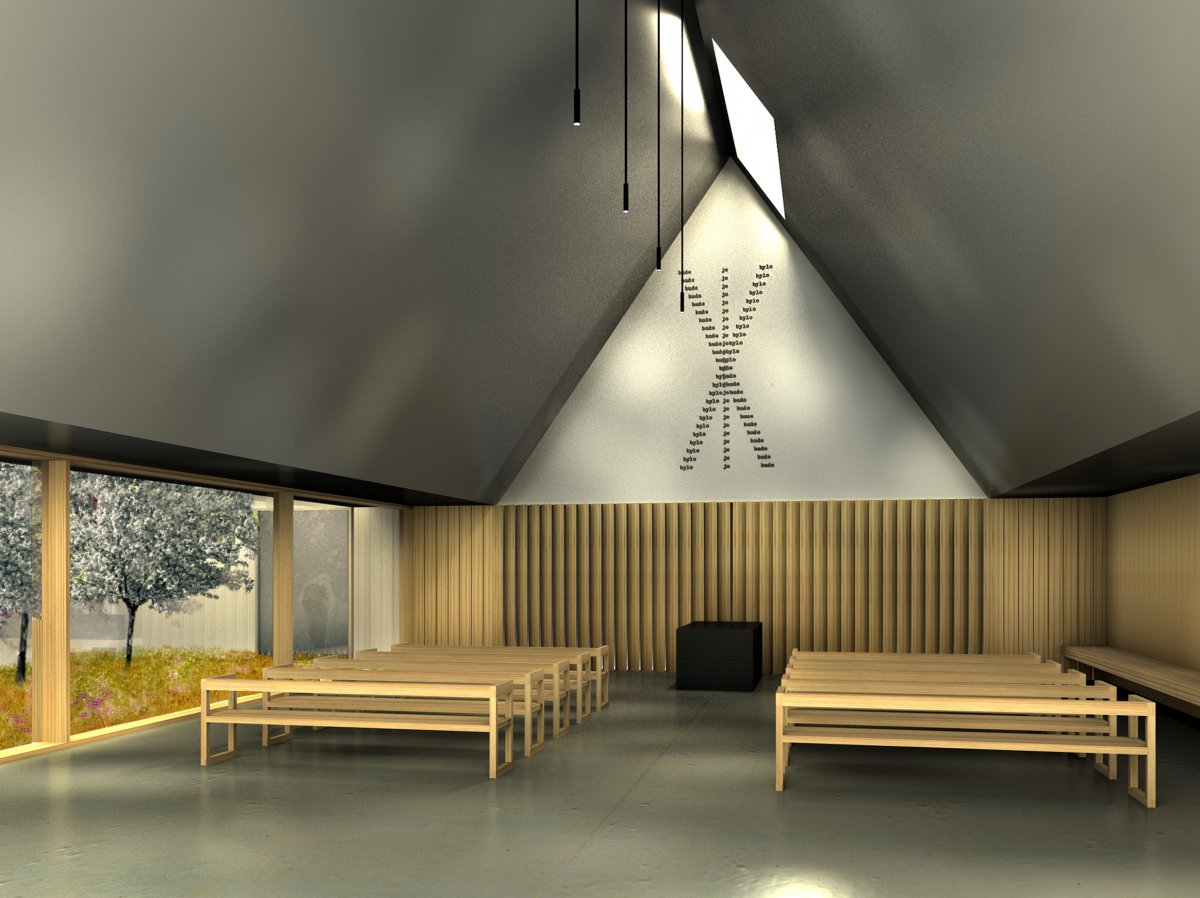 Obřadní síň svou požadovanou kapacitou je určena i pro poměrně velké pohřby. Jak ale zároveň vytvořit prostředí, které měřítkem bude patřičně sloužit i malým obřadům? Výrazně převýšená střední část, snížené intimněji působící boky místnosti a variabilita příčného i podélného umístění lavic by mohly být odpovědí. V případě opravdu velké účasti lze navíc využít i trojice dvoukřídlých dveří mezi vestibulem a síní a prostory propojit.