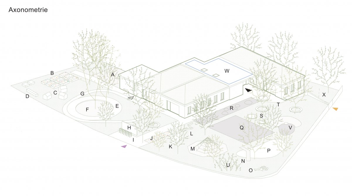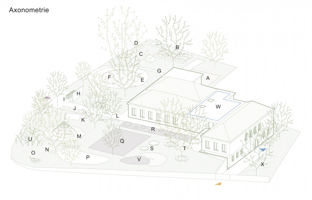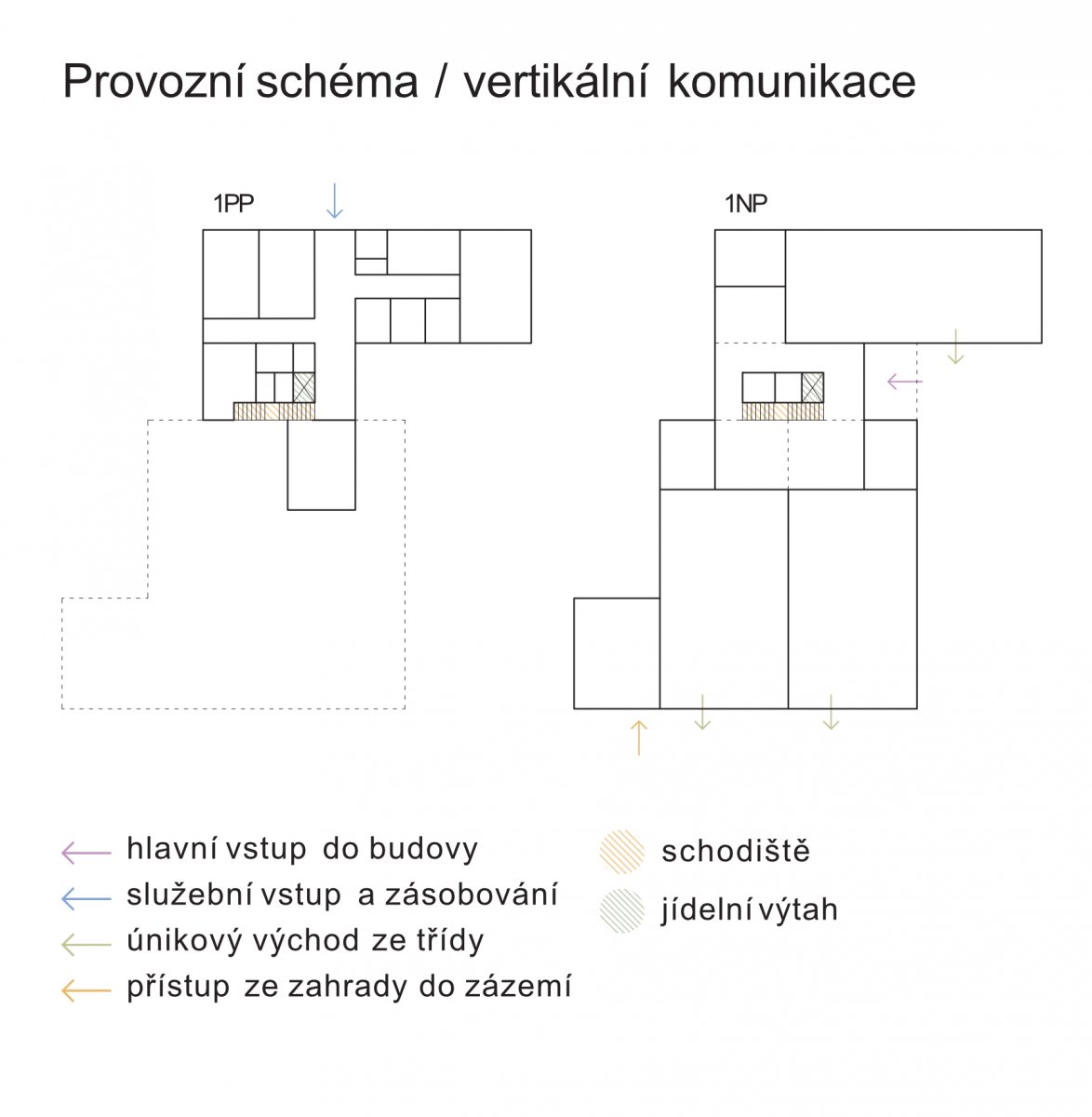 Ze zahrady je navržen nový krytý vstup, s informační vitrínou, do společného vestibulu. Na něj navazují šatny, umývárny a jednotlivé třídy (3 třídy po 24 dětech). Jádrem vestibulu jsou vertikální komunikace (schodiště a jídelní výtah) propojující podlaží se suterénem, úklidová místnost a toaleta pro dospělé.