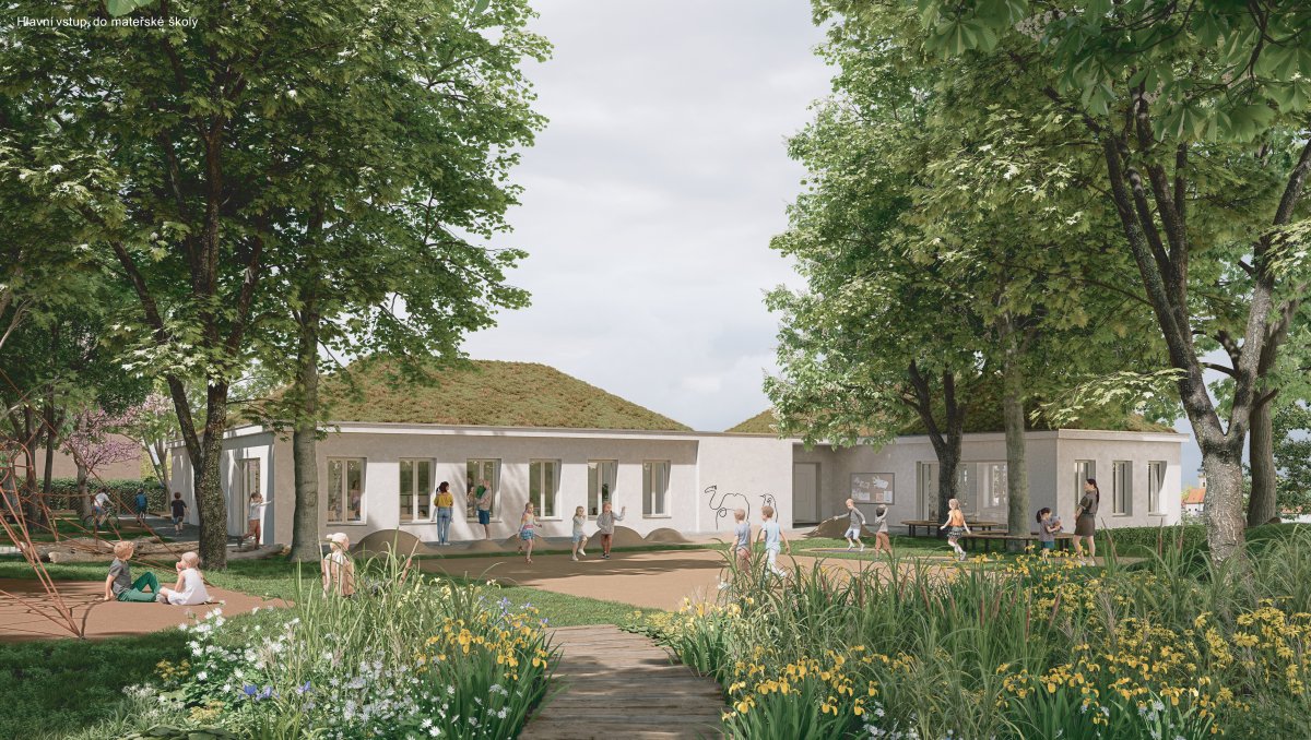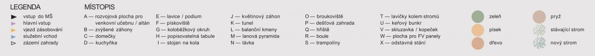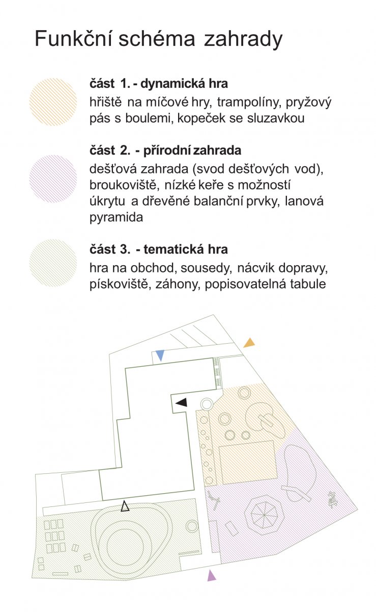 Zahradu dělí od zásobovací části opěrná stěna s obslužným venkovním schodištěm umístěným podél objektu školky. Hlavní vstup z ulice Husova je zachován a slouží pouze dětem a jejich doprovodu. Za vstupem je navržena rozšířená plocha pro kola a koloběžky. Herní prvky podél cesty přímo navádí ke vstupu do objektu. Zahrada je provozně rozdělena na tři části: zahradu dynamickou (hřiště na míčové hry, trampolíny, pryžový pás s boulemi, kopeček se skluzavkou), zahradu přírodní (dešťová zahrada s vyústěním většiny dešťových vod a návazností na modrozelenou infrastrukturu návrhu, broukoviště, nízké keře s možností úkrytu - divočina a dřevěné balanční prvky, včetně stávající lanové pyramidy) a zahradu tematickou (domečky pro hry na obchod, sousedy, nácvik dopravy - okruh pro koloběžky, pískoviště - písková laboratoř a pěstitelské záhony. Zde je i plocha pro případnou venkovní učebnu, skleník apod.