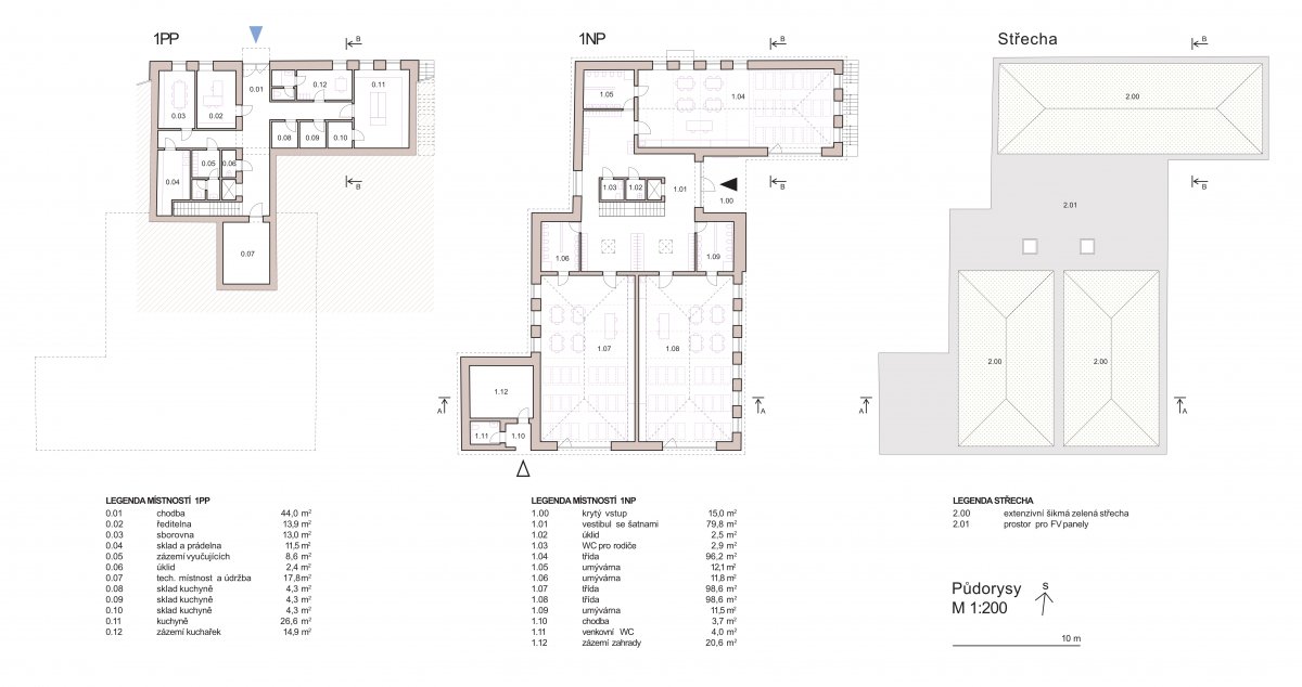 Provozně oddělujeme část pro děti a pro zázemí školky a každá má svůj samostatný vstup. Dětem je určeno první patro z jižní strany v úrovni zahrady, zázemí je umístěno do suterénu ze severní strany.